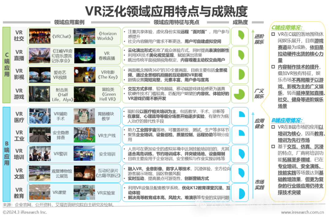 对于消费级领域,游戏是VR在C端落地最早且相对成熟的场景,VR游戏用户的行业教育程度最深,导致其对VR产品及服务的敏感性增强。行业后续衍生的C端场景中,直播、社交等聚焦动态与实时交互的细分应用对响应时长、交互质量更为关注。VR影视更多依赖预先开发内容,应用重点在于展示。对于行业级领域,工业、医疗等技术门槛高的场景较为关注VR设备的可操作性,因而与应用效果直接关联的各项参数,均为该场景的关注重点。在教育、培训等场景,VR技术与产品的应用价值多体现为对行业工作模式的创新改革,领域用户对VR技术、服务性能容忍度更高。
