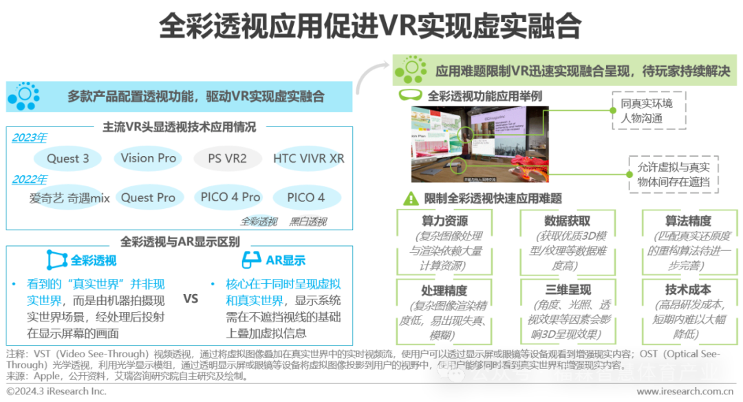 Quest 3打开了MR的大门,Vision Pro的发布开启了MR时代。透视技术是MR的核心,其中,AR眼镜多采用OST方案,VST则更适合当前主流的VR产品形态。自2022年起,业内已有玩家开始在VR中引入透视功能,Vision Pro对VST的采用,将引导更多厂商对VR设备配置透视功能。VR注重用户的沉浸感,因此传统设备强调与真实世界的完全脱离;但若期望VR设备可以完全融入用户日常工作生活,同真实世界的正常交流不可避免。目前,VST已历经黑白透视、单目彩色方案迈入全彩透视阶段,全彩透视功能的实现促进虚拟现实体验向虚实融合迈进,用户可在虚拟环境中同现实世界产生交互。短期内彩色透视技术的普及应用仍然受限于多种因素,特别是来自算力资源、算法精度、技术成本等方面的压力,有待行业玩家,特别是头部企业持续实践推进。