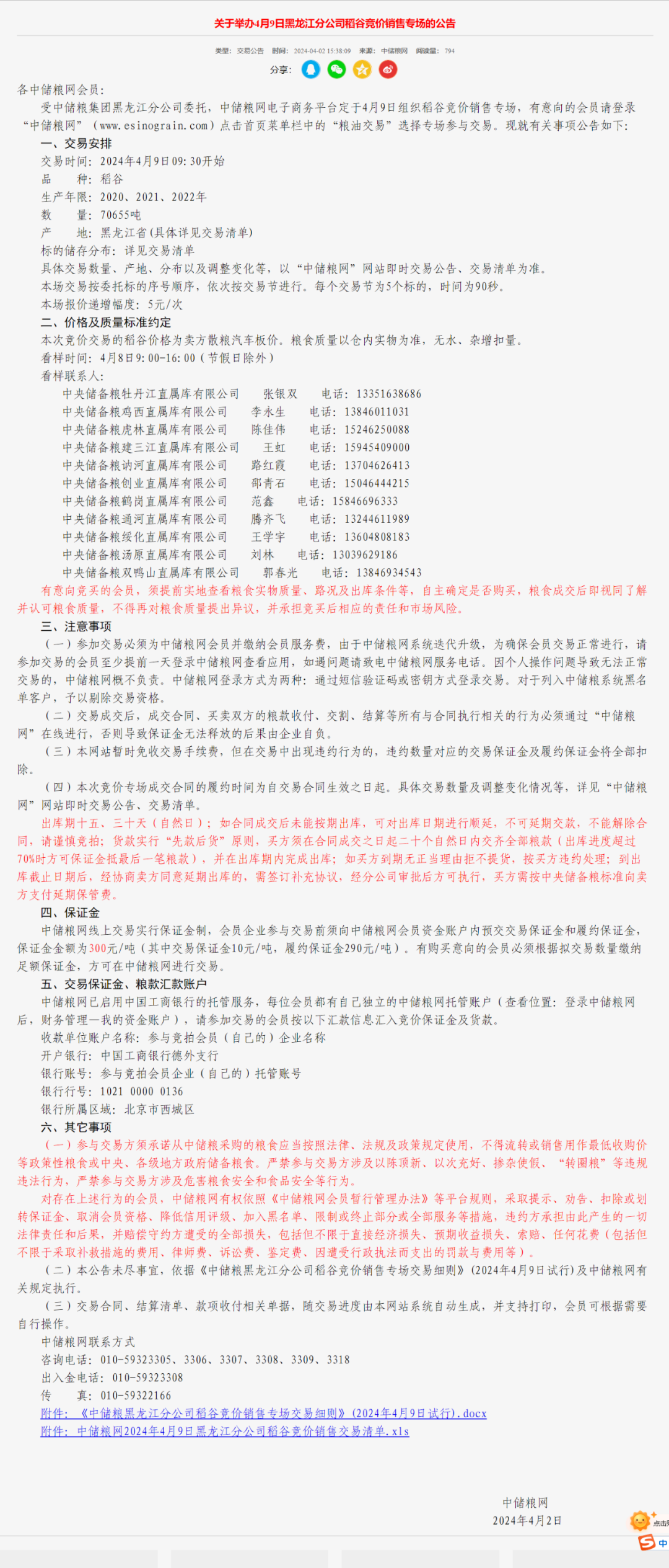 关于举办4月9日黑龙江分公司稻谷竞价销售专场的公告