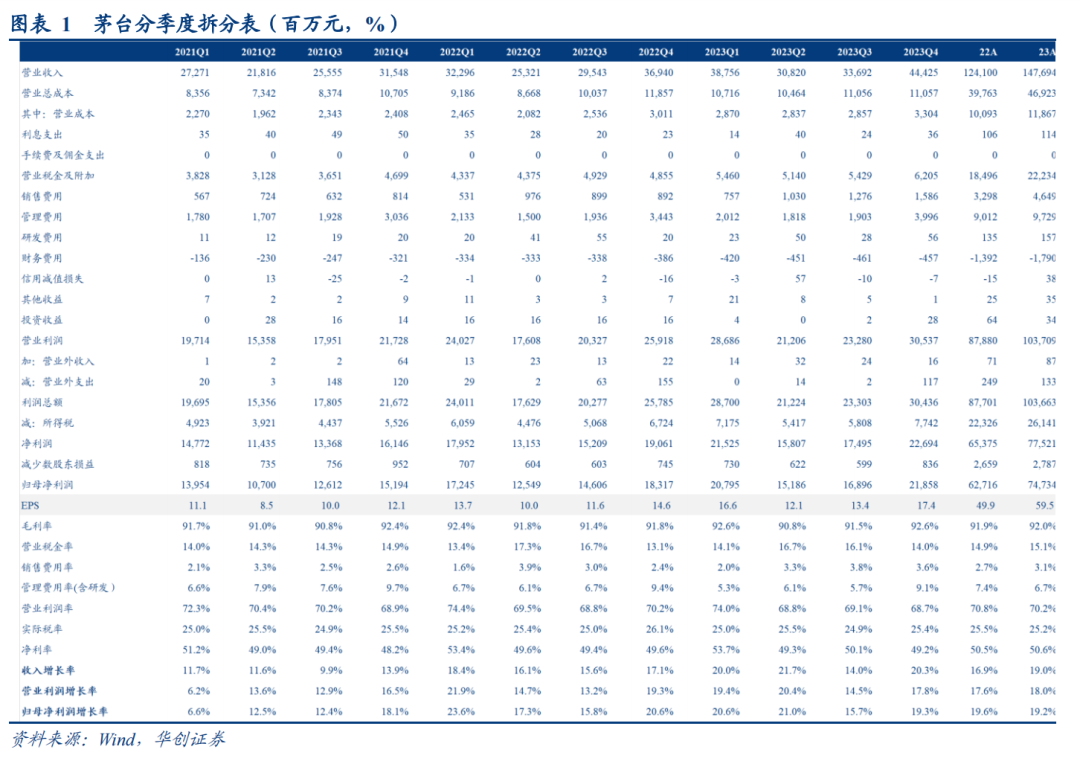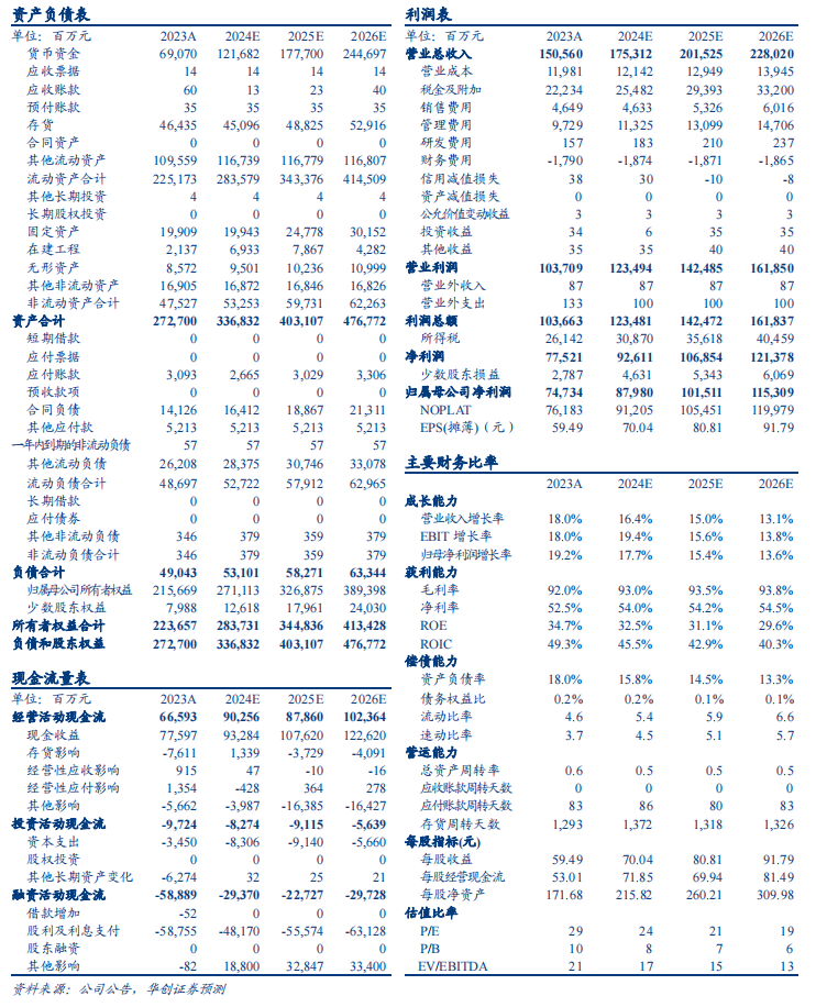 现金流指标健康,盈利水平稳中略升。现金流方面,Q4销售回款524.5亿元,增长17.4%,基本与收入增长匹配,而Q4经营现金流量净额165.9亿元,下降39.2%,主要系财务公司拆出资金影响,与主业关系不大,合同负债141.3亿元,维持高位保持稳健。盈利水平方面,23年毛利率92.1%,同比持平,营业税金率/销售费用率/管理费用率分别同比+0.3pct/+0.5pct/-0.6pct,净利率51.5%,同比微升0.2pct。