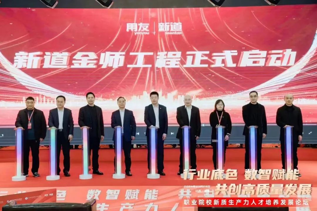 教育部提出的“五金”工程——“金专业、金课程、金师资、金基地、金教材”是在新时代职业教育新基建的背景下,以推动职业教育高质量发展为目标而实施的一项重要举措,旨在进一步深化职业教育的内涵建设,通过升级专业、更新课程、建设师资、打造基地以及优化教材,从而提升职业教育的质量和水平。我校顾亚文副校长受邀参与了新道金师工程启动仪式。