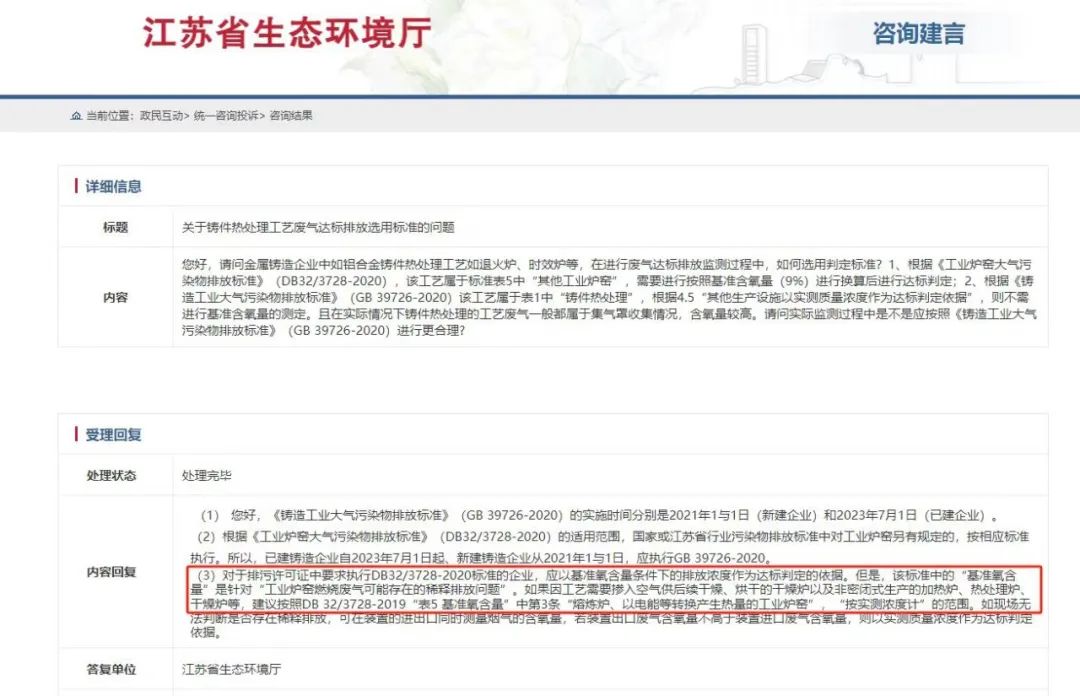 如果因工艺需要掺入空气供后续干燥、烘干的干燥炉以及非密闭式生产的加热炉、热处理炉、干燥炉等,建议按照DB 32/3728-2020“表5基准氧含量”中第3条“熔炼炉、以电能等转换产生热量的工业炉窑”,“按实测浓度计”的范围。