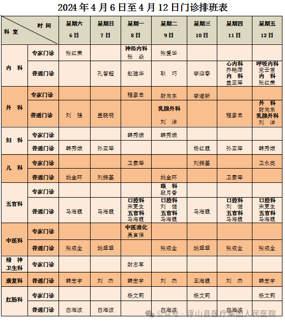 为了更好地方便广大患者朋友们,现将浮山县医疗集团人民医院4月6日——4月12日门诊坐诊医生排班表告知大家。