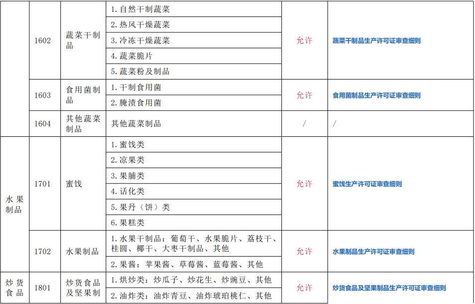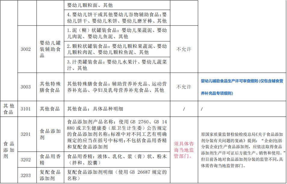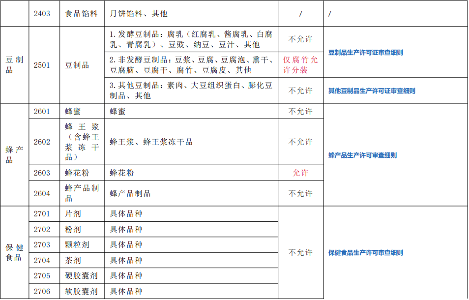 综上,是否允许分装主要来源于相应品类细则的规定,也有部分特殊情况。结合《食品生产许可分类目录》,允许分装的食品包括:0102大米、0104其他粮食加工品(谷物加工品、谷物碾磨加工品)、0201食用植物油、0303味精、0702其他方便食品(纯麦片类产品)、1301糖果、1302巧克力及巧克力制品、1303代可可脂巧克力及代可可脂巧克力制品、1401茶叶(除边销茶外允许)、1404代用茶、1602蔬菜干制品、1603食用菌制品、1701蜜饯、1702水果制品、1801炒货食品及坚果制品、2002焙炒咖啡、2101糖、2201干制水产品、2202盐渍水产品、2205熟制水产品(仅干制品允许分装)、2301淀粉及淀粉制品(淀粉)、2302淀粉糖、2501豆制品(仅腐竹允许分装)、2603蜂花粉、食品添加剂(具体建议咨询当地监管部门)。