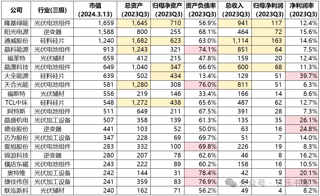 上图为市值排名前20名的公司财务规模情况,如上图所示,总资产前5名均超过了1000亿,归母净资产最高为隆基绿能达到了710亿,其次是通威和TCL中环;收入和净利润是2023年前三季度累计数字,收入最高为通威,其次是隆基,归母净利润最高是通威的163亿,其次是隆基117亿;资产负债率最高是奥特维达到了78.4%,比较危险,大全能源最低,为13.4%,负债压力最小;净利润率方面最高为大全能源,接近40%,而天合光能最低,仅有6.3%。