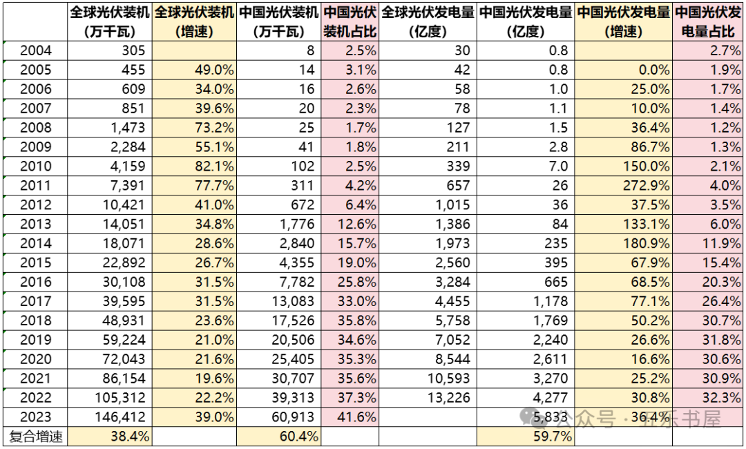 上图是全球及中国的光伏装机和发电量情况,从图中可以看出,全球范围来看,光伏行业增速巨大,从2004年的305万千瓦增加到2023年的14.6亿千瓦,19年年化复合增速达到了38.4%,这个行业也是增速最快的能源形式;相比于全球,中国光伏市场增速更快,从2004年的8万千瓦,增加到2023年的6.1亿千瓦,年化复合增速高达60.4%,在全球的占比也从2.5%增加到41.6%,已经成为了全球光伏最大的市场。
