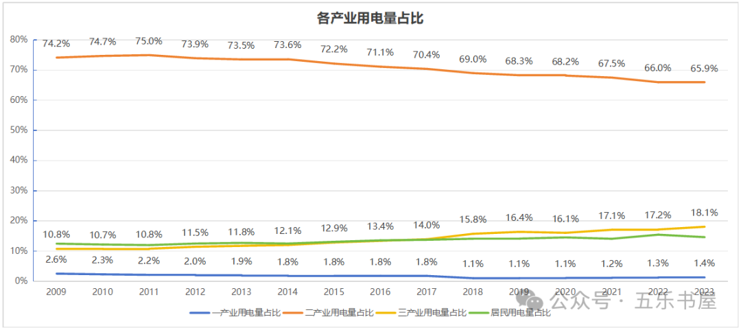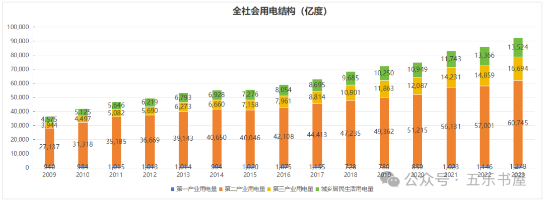 如上图所示,在2023年,第一产业用电量为1278亿度,占比1.4%;第二产业用电量6万亿度,占比66%;第三产业用电量1.67万亿度,占比18.1%;城乡居民生活用电量1.35万亿度,占比14.7%。