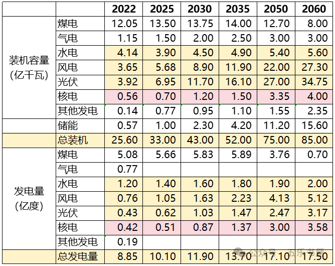 上图为2023年7月出版的《中国能源展望2060》中对未来全国发电装机容量和发电量的预测,其中的核电数据《我国核电发展规划研究》有所修订,水电由于开发条件限制增长有限;煤电气电将在2035年左右到达峰值,随后下降;风电和光伏将会持续性的爆发式增长;核电也会较高速的增长。