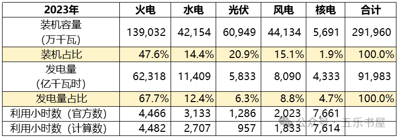 在上图中,利用小时数的官方数据和计算数据有所差异,特别是水风光三者差异较大,主要是统计口径的问题,官方数据由大型电站逐个统计并加权得来,计算数只是简单粗暴的将发电量除以装机容量,比如光伏,由于2023年新增装机容量高达2.17亿千瓦,而这些新增装机当年的发电小时数肯定小于全年平均数,所以拉低了整体水平。总体而言差异不大,我们主要参考官方数据。