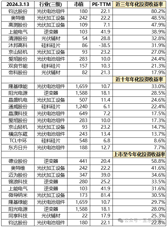 近3年年化投资回报率最高的是钧达股份、奥特维和高测股份;近10年年化投资回报率最高的是隆基绿能、阳光电源和晶盛机电;上市以来年化投资回报率最高的是德业股份、奥特维和迈为股份。