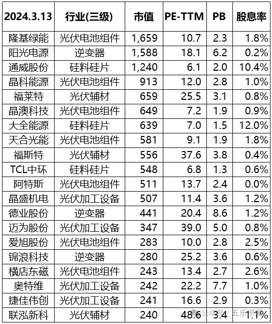 上图为2024年3月13日市值前20的A股光伏设备公司,隆基绿能、阳光电源和通威股份是TOP3,当前也只有这三家市值超过1000亿的公司。在这20家公司中,光伏电池组件7家,逆变器3家,硅料硅片3家,光伏加工设备4家,辅材3家。