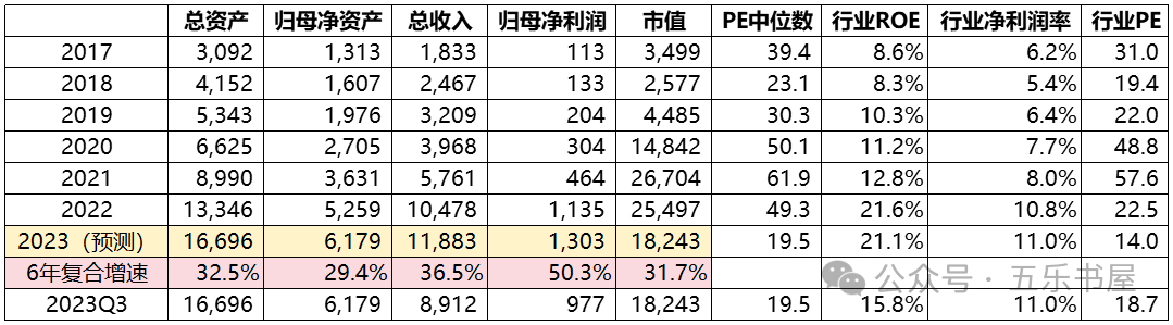 上图是我提取出来的行业整体数据,这些数据反映的是A股上市公司的情况,不能完全代表行业,比如2021年晶科就还没有在A股上市,不过数据不会差的太远,毕竟大部分光伏头部公司17年都是在A股上市了的。其中,2023年只有三季度的财务数据,对2023年整体的收入和利润按三季度数据成比例年化进行预测,总资产和净资产假设不变。