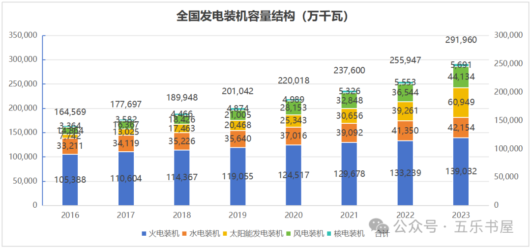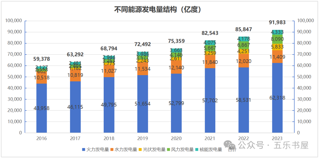 但从图中我们可以看到,本书对光伏的预测保守了,书中预测2023年及以后每年光伏新增装机1亿千瓦左右,但实际上2023年(本文写作时间为2024年3月)全年新增装机2.16亿千瓦,发电量在2023年就达到了5833亿度,所以此书数据仅供参考,是一个方向上的指引,不能以上图数据作为决策依据。