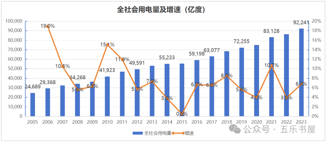 2006年,中国全社会用电量为2.9万亿度,到2023年则上升到了9.2万亿度,年复合增长率7.6%左右,与我国GDP复合增速基本匹配。