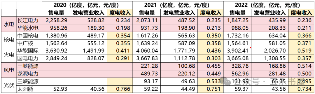 1)水电的度电成本最低。长江电力和华能水电在2022年的度电成本差不多都是0.09元/度,但前两年长电的成本更低一些,主要原因是2022年长江来水较差,成本比较固定的情况下,售电量更低一些。