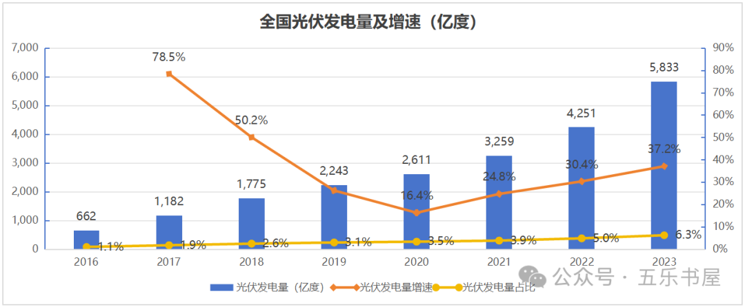 如上图所示,自2016年到2023年,光伏发电量年化复合增速高达36.5%,2023年全年光伏发电量达到5833亿度,在所有发电量中占比从2016年的1.1%增加到2023年的6.3%。