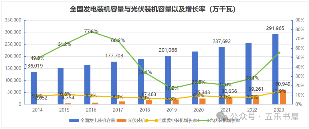 如上图所示,截止2023年,我国全部的装机容量为29.2亿千瓦,其中光伏达到6.1亿千瓦,就增速而言,自2014年到2023年,全部装机平均增速为8.9%,光伏装机容量平均增速为41.7%,仅2023年一年,我国就新增装机2.17亿千瓦,增速远大于所有其他发电装机容量。我国光伏发电行业还处于高速发展期。