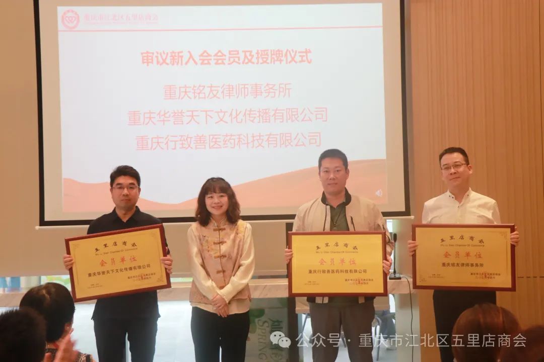 会议还审议通过《重庆铭友律师事务所》《重庆华誉天下文化传播公司》《重庆行致善医药公司》为商会新会员并授牌。