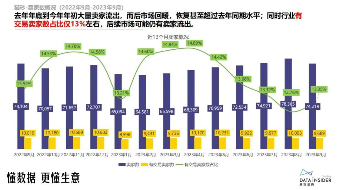 去年年底到今年年初大量卖家流出,而后市场回暖,恢复甚至超过去年同期水平;同时行业有交易卖家数占比仅13%左右,后续市场可能仍有卖家流出。