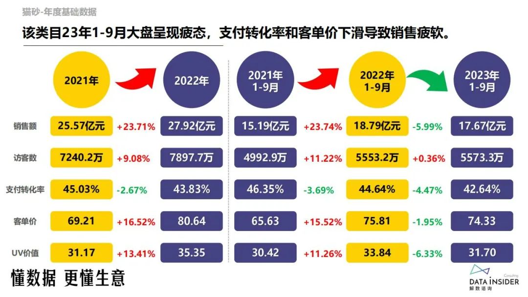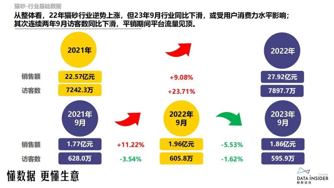 从整体看,22年猫砂行业逆势上涨,但23年9月行业同比下滑,或受用户消费力水平影响;其次连续两年9月访客数同比下滑,平销期间平台流量见顶。