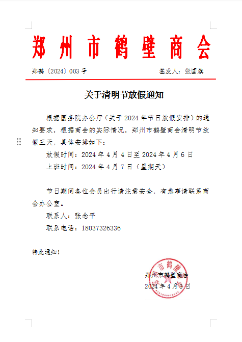 根据国务院办公厅(关于2024年节日放假安排)的通知要求,根据商会的实际情况,郑州市鹤壁商会清明节放假三天,具体安排如下: