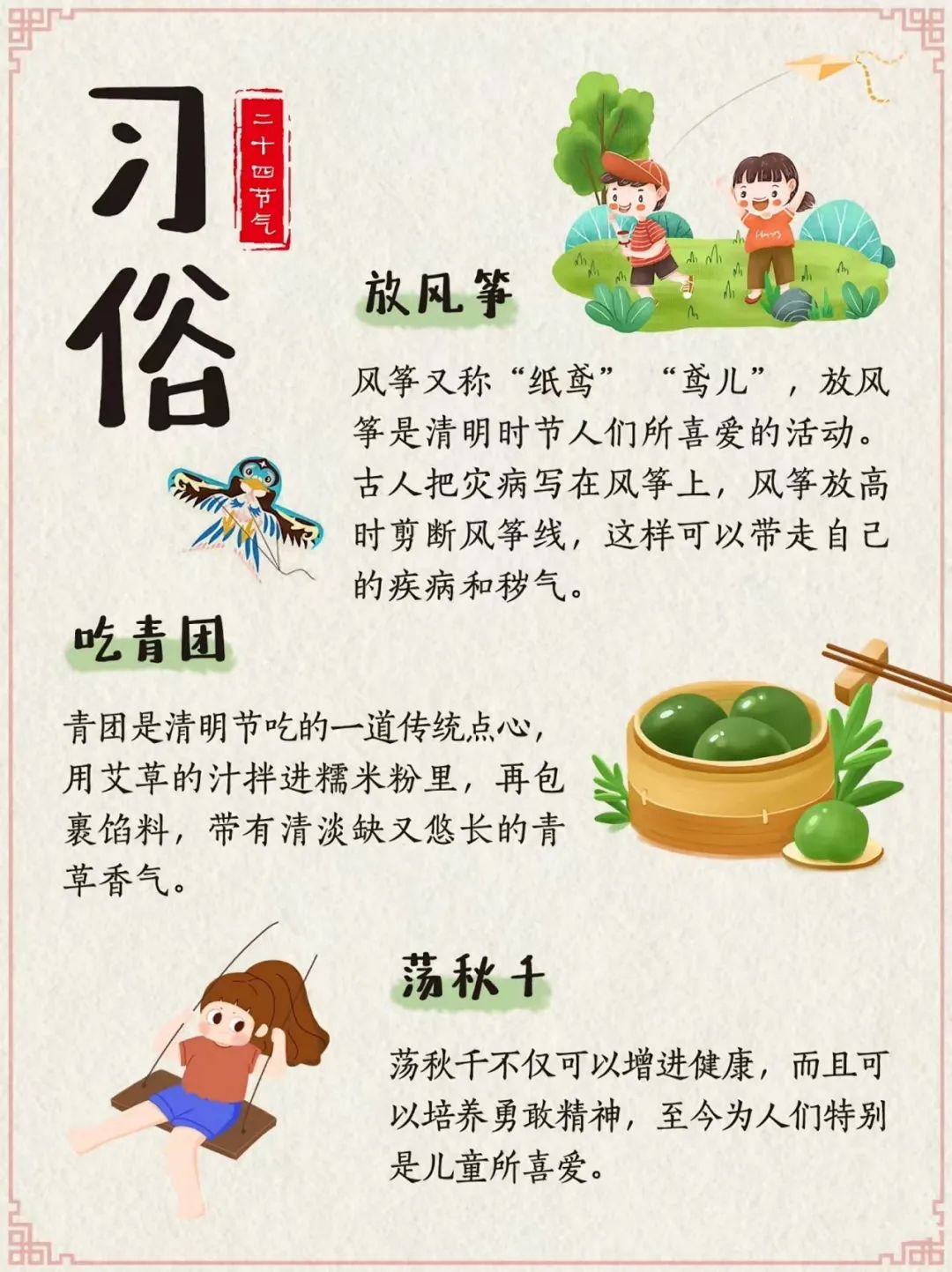 清明节,又称踏青节、行清节、祭祖节等,在仲春与暮春之交。清明节兼具自然与人文两大内涵,既是自然节气点,也是传统节日。扫墓祭祖与踏青郊游是清明节的两大礼俗主题,这两大传统礼俗在中国自古传承,至今不辍。