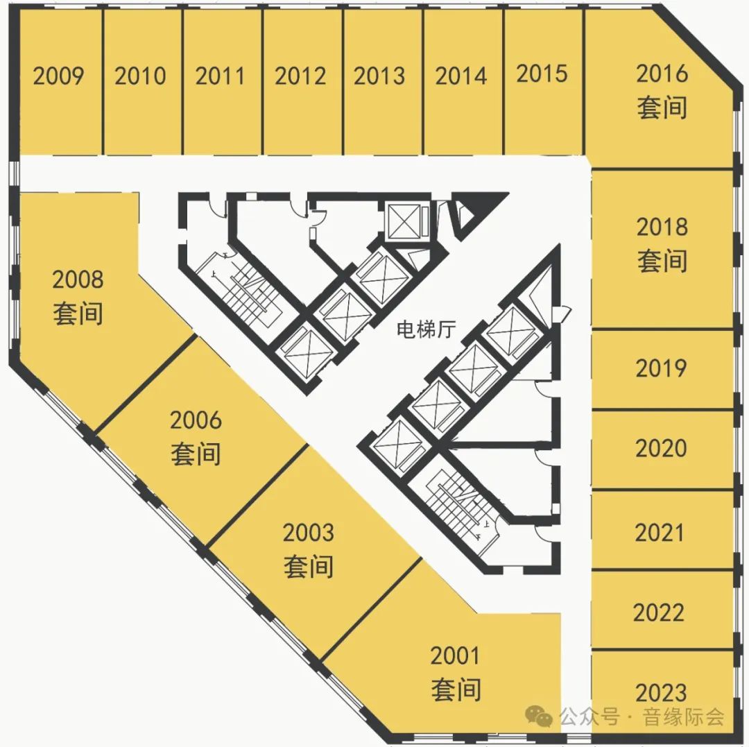 20楼提供18间展房,包括6个套间和12个单间。