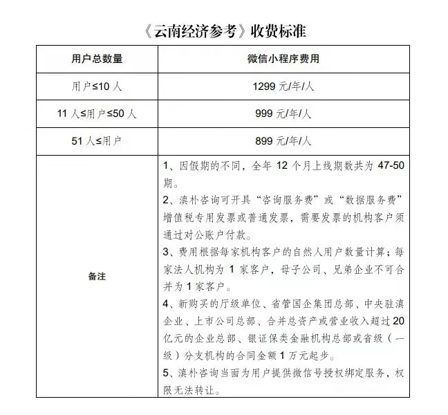 机构用户订阅事宜,请联系滇朴咨询小秘书(微信号:dianpuxiaomishu),或拨打服务热线:0871-6584 6112。《云南经济参考》订阅收费标准如下:
