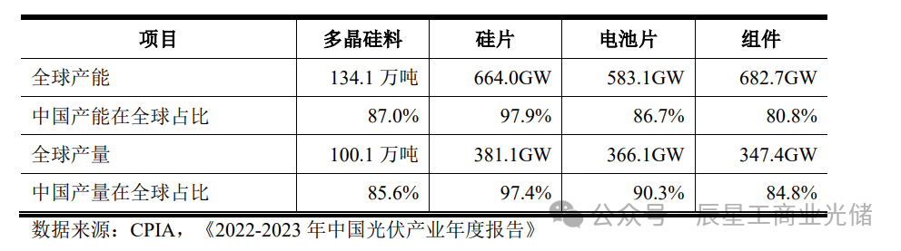 受益于完整的市场环境和完善的配套环境,我国在光伏行业的技术及成本 控制方面形成了较大的优势,推动光伏产业链各个环节持续快速发展。目前我 国在光伏产业各环节的产能、产量在全球范围内均占据主导地位,中国已成为 全球光伏产业重心。2022 年,全球光伏产品产能、产量及中国产品在全球的占 比情况如下: