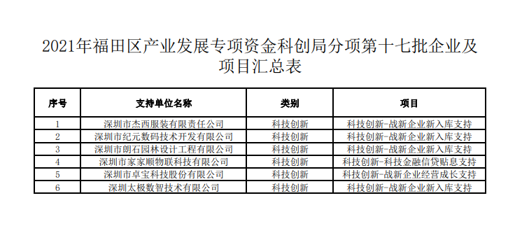 2021年福田区产业发展专项资金科创局分项第十七批拟支持企业及项目的公示