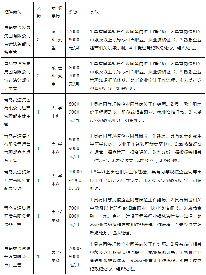 青岛交通发展集团总部及直属管理公司招聘公告