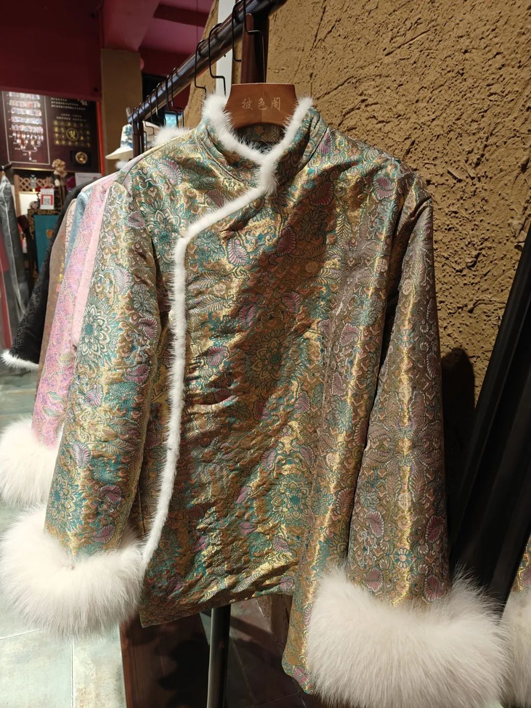 在色彩上,以中国传统色彩为基础,如中国红、琉璃黄、青花蓝;在材质上,以非遗面料为主,如真丝、宋锦、香云纱、漳绒等。