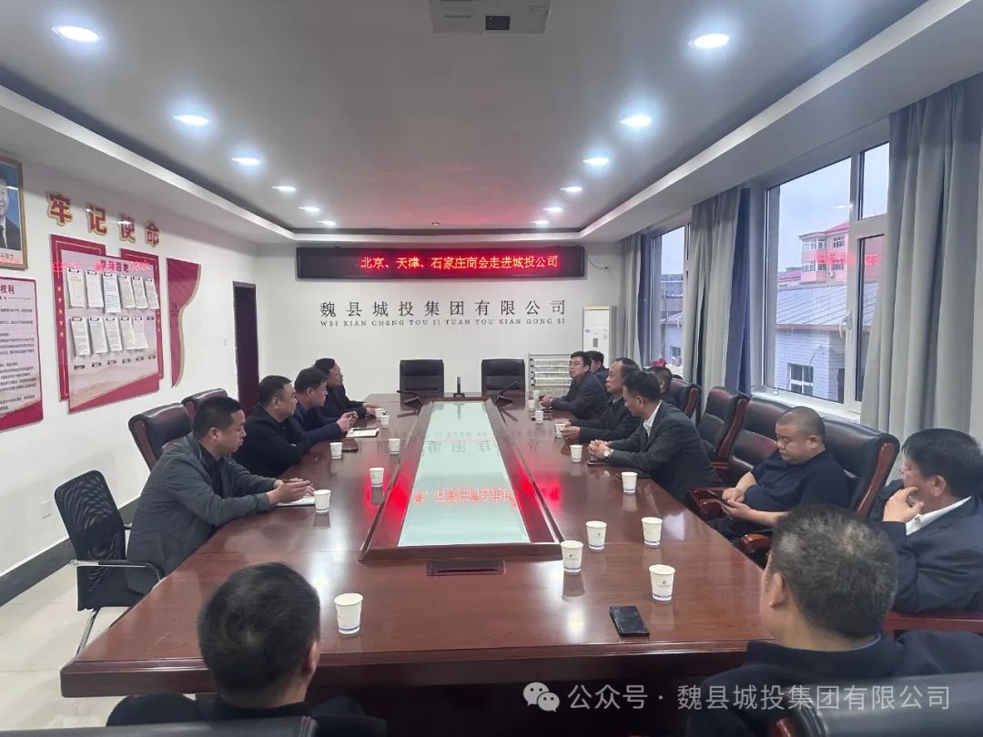 4月3日下午,城投公司邀请在外魏县籍企业家返乡就家乡发展进行交流座谈,北京商会会长白冠平、天津商会会长李猛、石家庄商会秘书长韩雨平等商会领导带领企业家代表走进城投公司。城投公司党支部书记、董事长边春兴,总经理肖鹏飞及领导班子成员参加座谈。