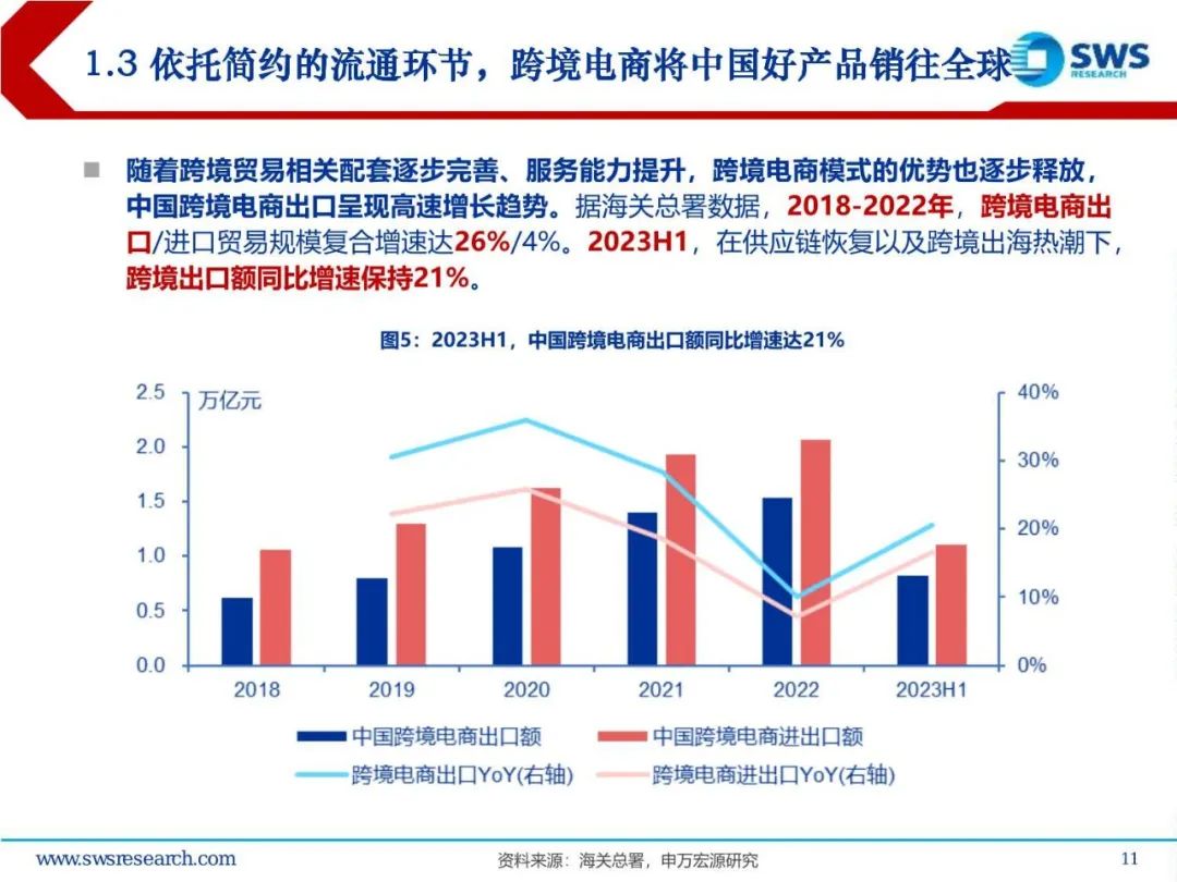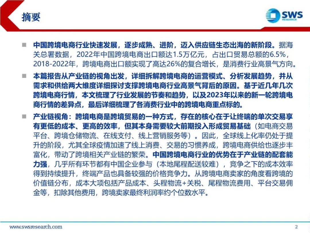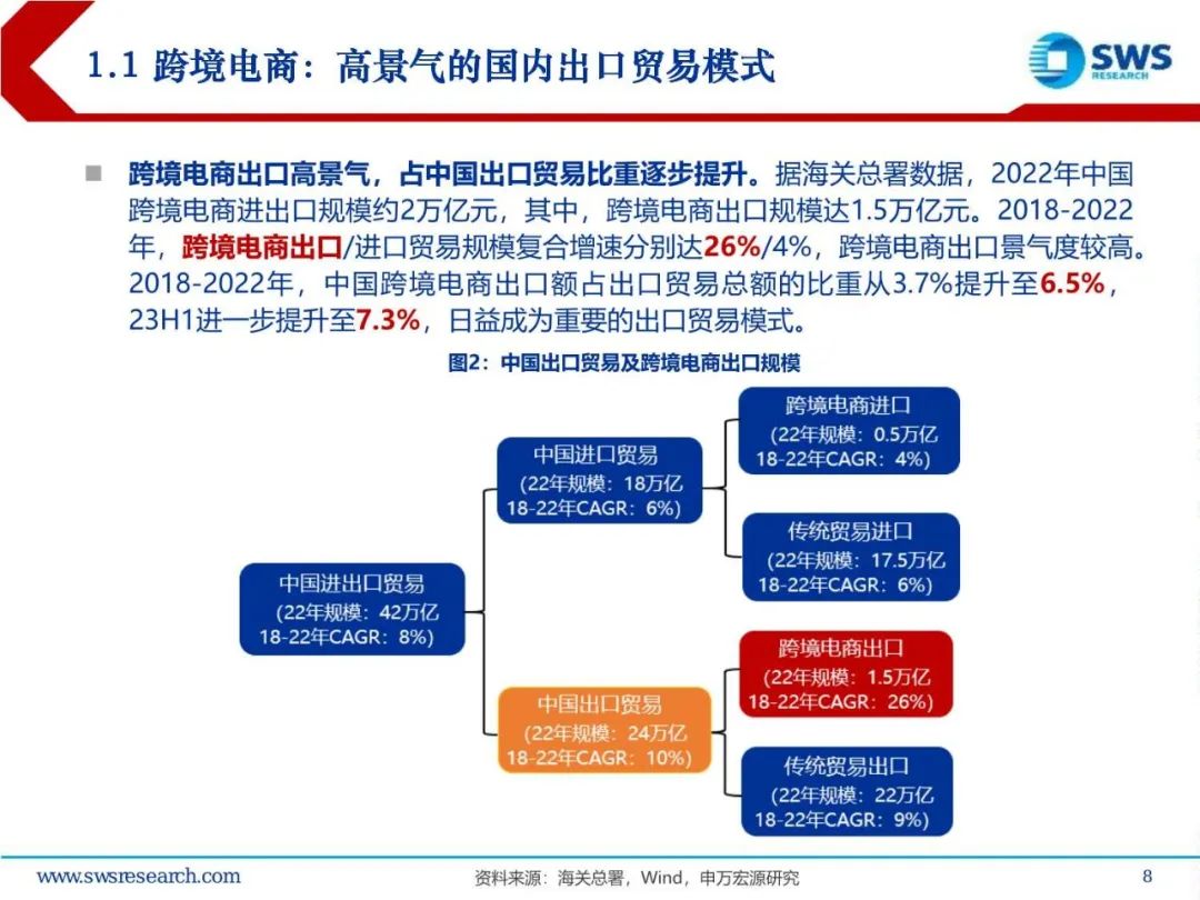 中国跨境电商行业快速发展,逐步成熟、进阶,迈入供应链生态出海的新阶段。据海关总署数据,2022年中国跨境电商出口额达1.5万亿元,占出口贸易总额的6.5%,2018-2022年,跨境电商出口额实现了高达26%的复合增长,是消费行业高景气方向。2. 产业链分析