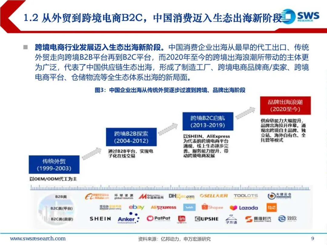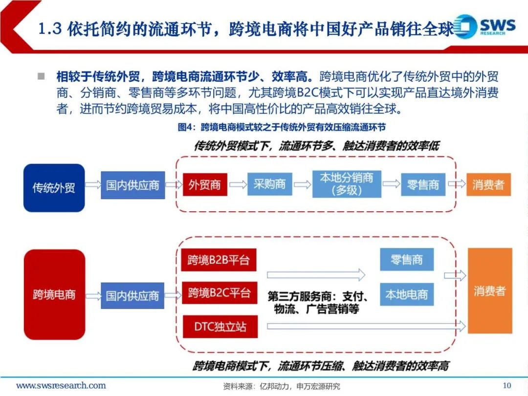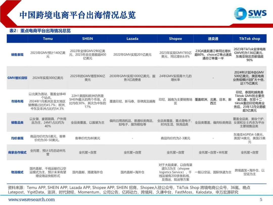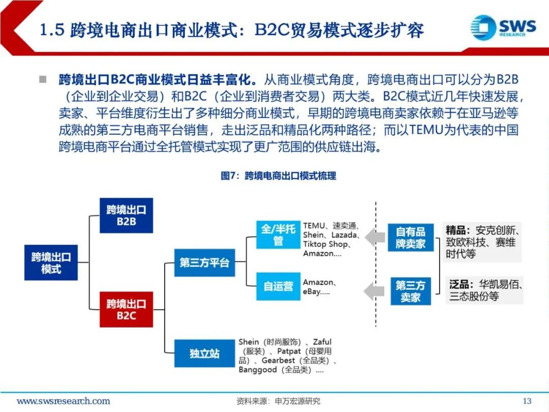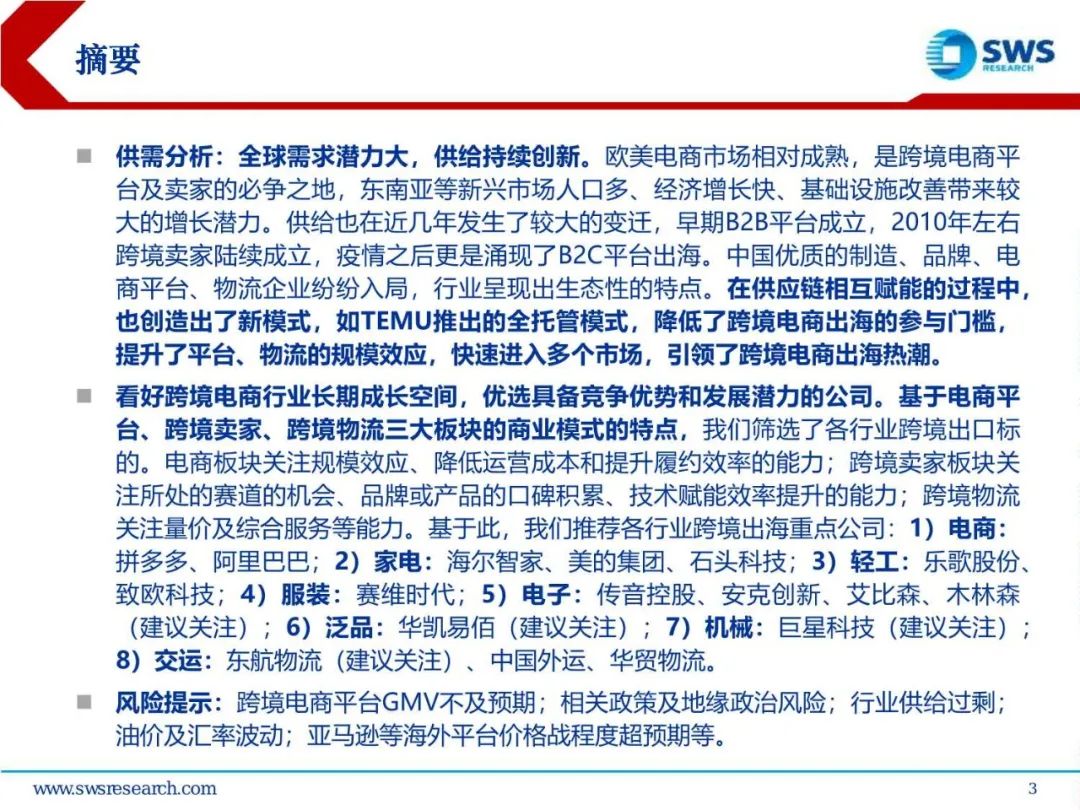 全球需求潜力大,供给持续创新。欧美电商市场相对成熟,是跨境电商平台及卖家的必争之地,东南亚等新兴市场人口多、经济增长快、基础设施改善带来较大的增长潜力。供给也在近几年发生了较大的变迁,早期B2B平台成立,2010年左右跨境卖家陆续成立,疫情之后更是涌现了B2C平台出海。中国优质的制造、品牌、电商平台、物流企业纷纷入局,行业呈现出生态性的特点。在供应链相互赋能的过程中,也创造出了新模式,如TEMU推出的全托管模式,降低了跨境电商出海的参与门槛,提升了平台、物流的规模效应,快速进入多个市场,引领了跨境电商出海热潮。#02#