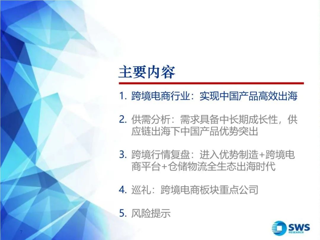 跨境电商是跨境贸易的一种方式,存在的核心在于让终端的单次交易享有更低的成本、更高的效率,但其本身需要较大前期投入形成贸易基础。中国跨境电商行业的优势在于产业链的配套能力强,几乎所有环节都有中国企业参与(本地尾程配送较难),竞争之下的成本效率得到持续提升,终端产品也具备较强的价格竞争力。3. 供需分析