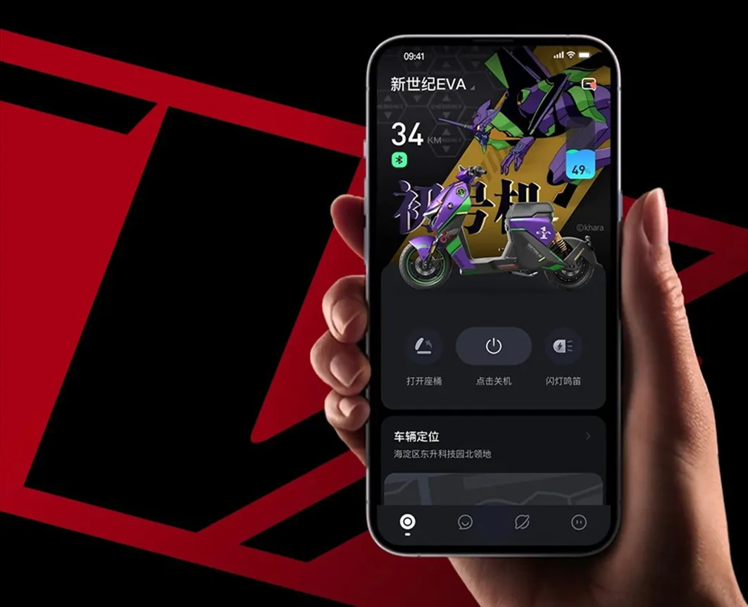 除了新车,官方也提供专属设计周边,联名款头盔、定制款自发光NFC卡片钥匙、全球唯一编号限量金属铭牌、联名包包,就连APP内动态界面也是专属定制的,为驾驶者提供从出发到抵达,一切都和EVA的沉浸式体验。