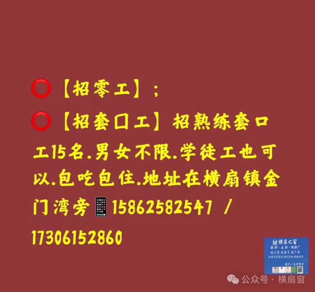 ⭕【招套囗工】招熟练套口工15名.男女不限.学徒工也可以.包吃包住.地址在横扇镇金门湾旁?15862582547 / 17306152860