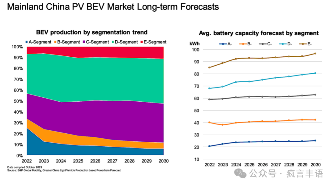 (到2030年,纯电动车型中,C/D/E尺寸级别的车型将会成为主要的销售车型。一方面是功能性+价格提升,另一方面是汽车品牌品牌溢价提升+消费市场的更新换代和成熟化演变;电池性能的逐步提升、电池续航里程的提升也会逐渐增加。