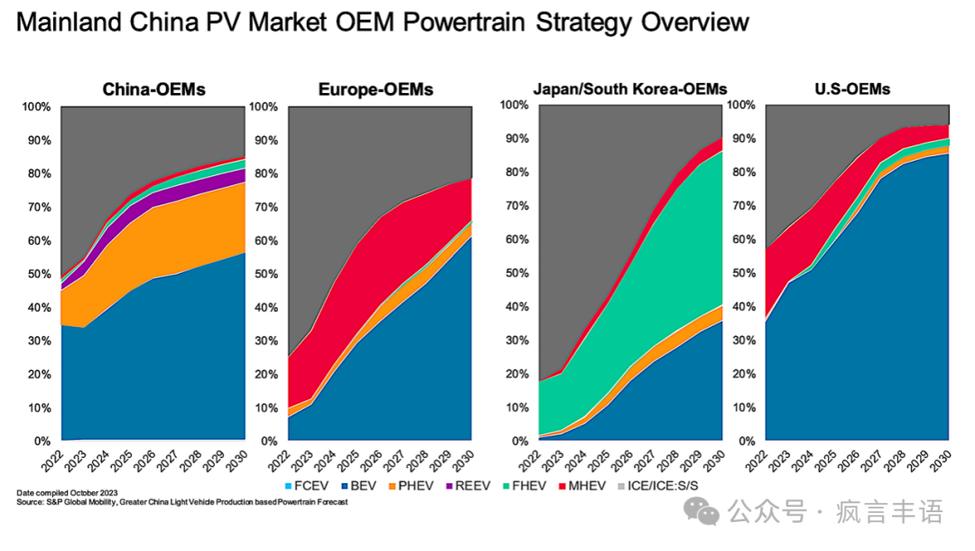 (到2030年,中国大陆与美国的BEV+PHEV+REEV市场都会超过80%;欧洲的NEV市场超过60%;只有日韩的BEV市场40%。