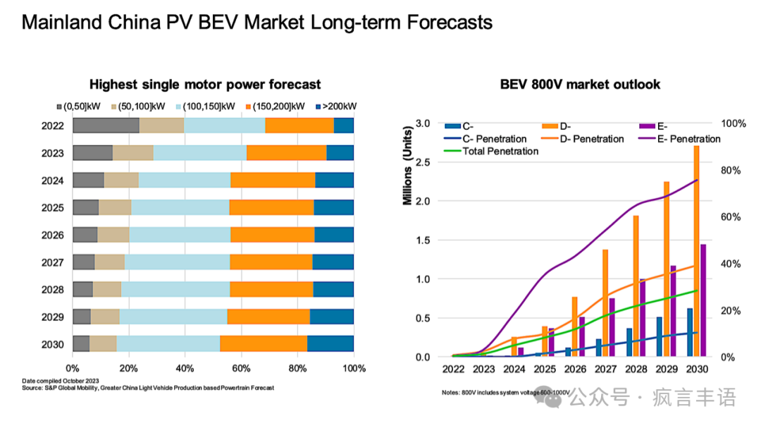(电机的性能将会不断提升,100~150KW、150~200KW的电机将会成为2030年的主流、超过200KW的电机也会成为下一个阶段的动力性能的必争之地;0~50KW、50~100KW将会逐渐减少。这很符合中国市场中的消费者+主机厂的共同需要,一方面客户要更好的加速性能+动力体验,另一方面主机厂需要更好的产品差异性+价格溢价,完美的结合。