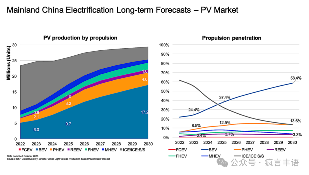 (无论如何,预测的数据虽然不一定准确。但是,从宏观政府的立场、微观汽车品牌企业、消费者市场的发展而言,乐观的期待是2030年的汽车销售达到接近3000万辆。不过,我不太认可,负债化的发展不可持续,2017~2018年的数据已经是阶段性的顶点了;中国汽车品牌的大发展是必然的,纯电汽车大发展也是一种趋势,不过,随着电池技术的不断迭代、带来需要处理的前期BEV车型的后续已经使用车辆的生命完结的处理、旧电池的处理将会是一个大问题。