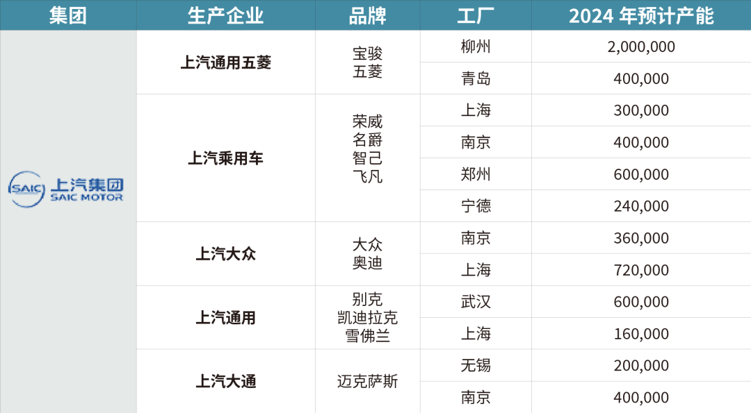 上汽大众在上海市嘉定区安亭镇拥有3个生产基地,主要生产大众、斯柯达、奥迪等品牌的车型,该工厂2023年生产了45万余辆汽车,2023年生产产能为96万,产能利用率为47.86%;上汽通用在上海浦东新区金桥镇设有两个生产基地,主要生产别克、雪佛兰、凯迪拉克等品牌的车型,该工厂2023年生产37万余辆汽车,2023年生产产能为51.33万辆,产能利用率为73.08%,预测其2024年产能约为48万辆。上汽乘用车则在上海浦东新区临港产业区设有生产基地,主要生产荣威、MG名爵、智己、飞凡等自主品牌的车型,该工厂2023年生产11万余辆汽车,2023年生产产能为30万辆,产能利用率为38.55%,预测其2024年产能约为30万辆。
