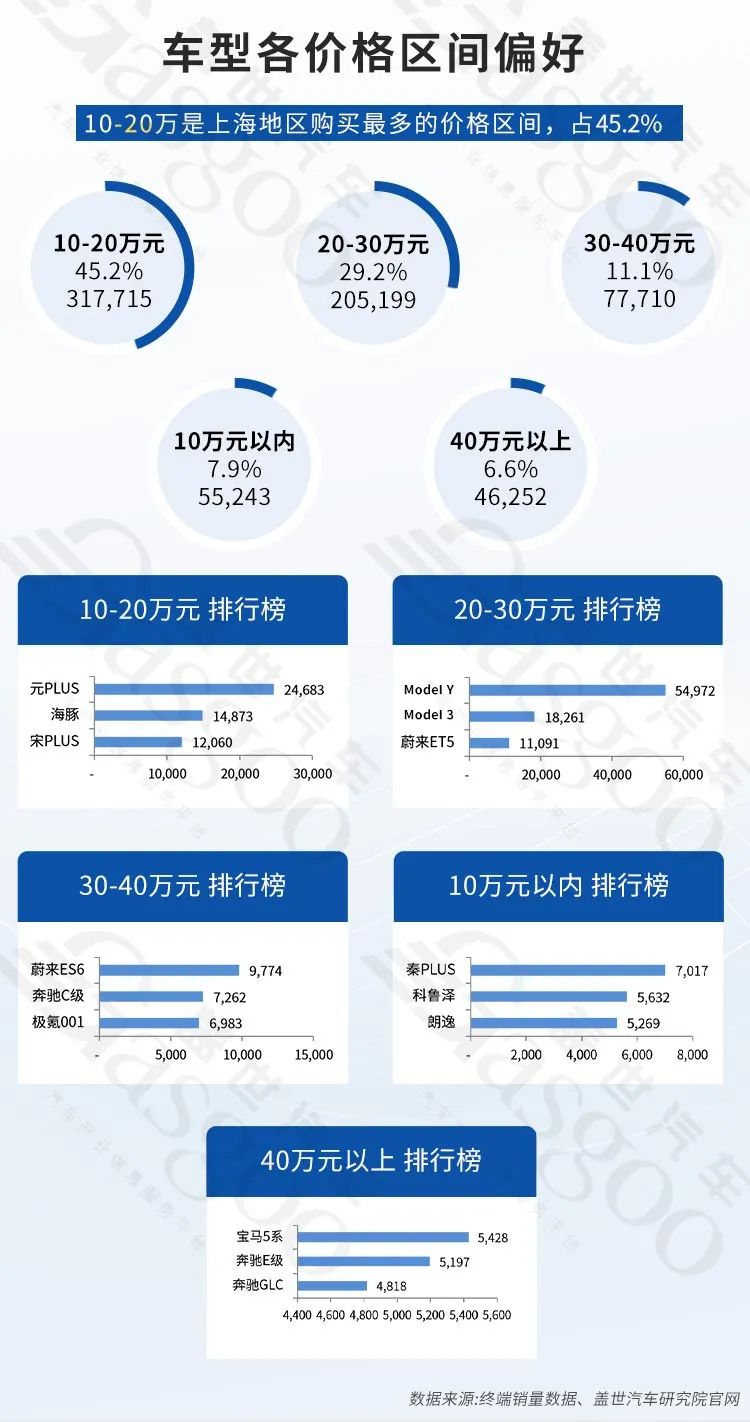 另外从车型来看,Model Y为上海地区选择最多的车型,2023年销量为54972辆,其次为元PLUS、Model 3、海豚和宝马3系。可以看出,在车型偏好方面,销量前五车型中的特斯拉Model Y、元PLUS、Model 3和海豚均为新能源车型。