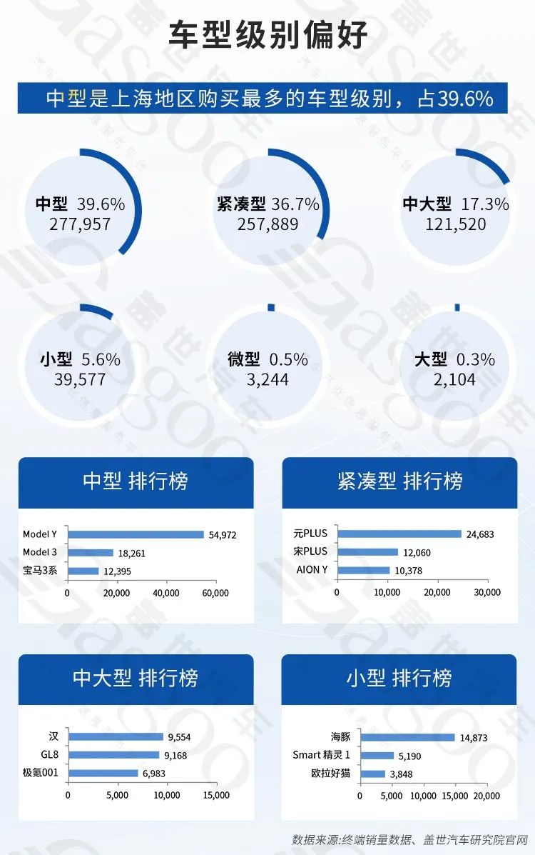 另外,中型车是上海地区购买最多的车型级别,销量为277957辆,占比39.6%,其次是紧凑型和中大型车,销量分别为257889辆和121520辆,分别占比36.7%和17.3%。