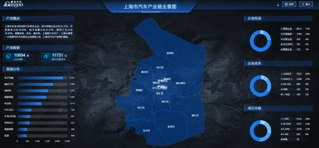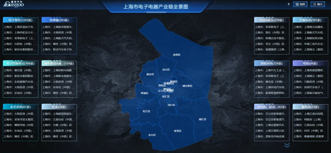 根据盖世汽车供应链平台数据来看,上海地区汽车产业链企业约10694家,其中占比最高的为电子电器类企业,共2293家,占比21.44%,其后占比最高的四类企业依次为通用工艺类企业共1796家,占比16.79%;原材料类企业共1547家,占比14.46%智能制造类企业共1458家,占比13.63%;电动化相关企业1214家,占比11.35%。
