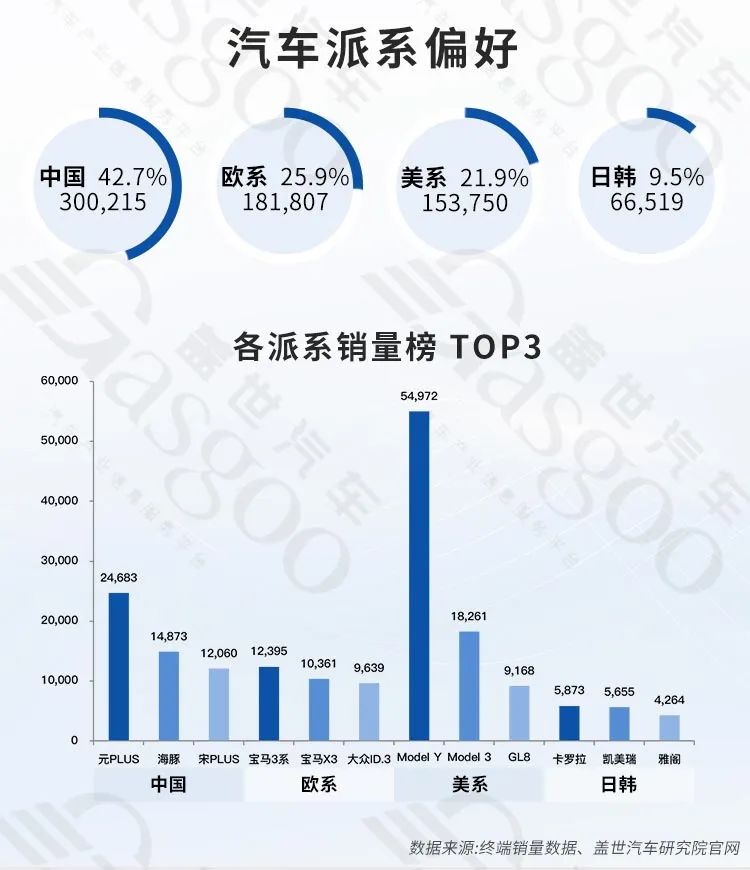 自主品牌中,销量前三为元PLUS、海豚和宋PLUS,销量分别为24683辆、14873辆、12060辆,欧系车中,销量前三为宝马3系、宝马X3和大众ID.3,销量分别为12395辆、10361辆、9639辆,美系车中,销量前三为Model Y、Model 3和GL8,销量分别为54972辆、18261辆、9168辆,日韩车系中,卖得最好的卡罗拉销量也仅为5873辆,其次为凯美瑞和雅阁,销量分别为5655辆、4264辆。