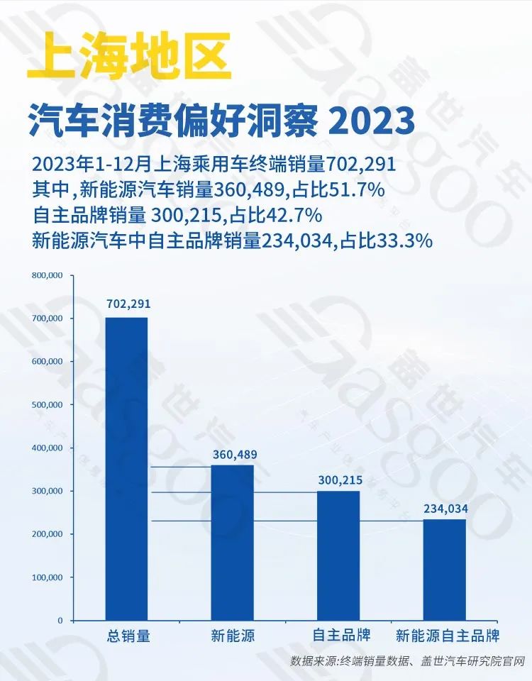 根据盖世汽车研究院终端数据整理来看,上海地区2023年乘用车终端销量为702291辆。其中,新能源汽车销量为360489辆,占比为51.7%。根据盖世汽车研究院数据库,2023年中国乘用车新能源汽车市场整体渗透率接近35%,上海新能源汽车终端销量渗透率已经远远超过全国平均水平。