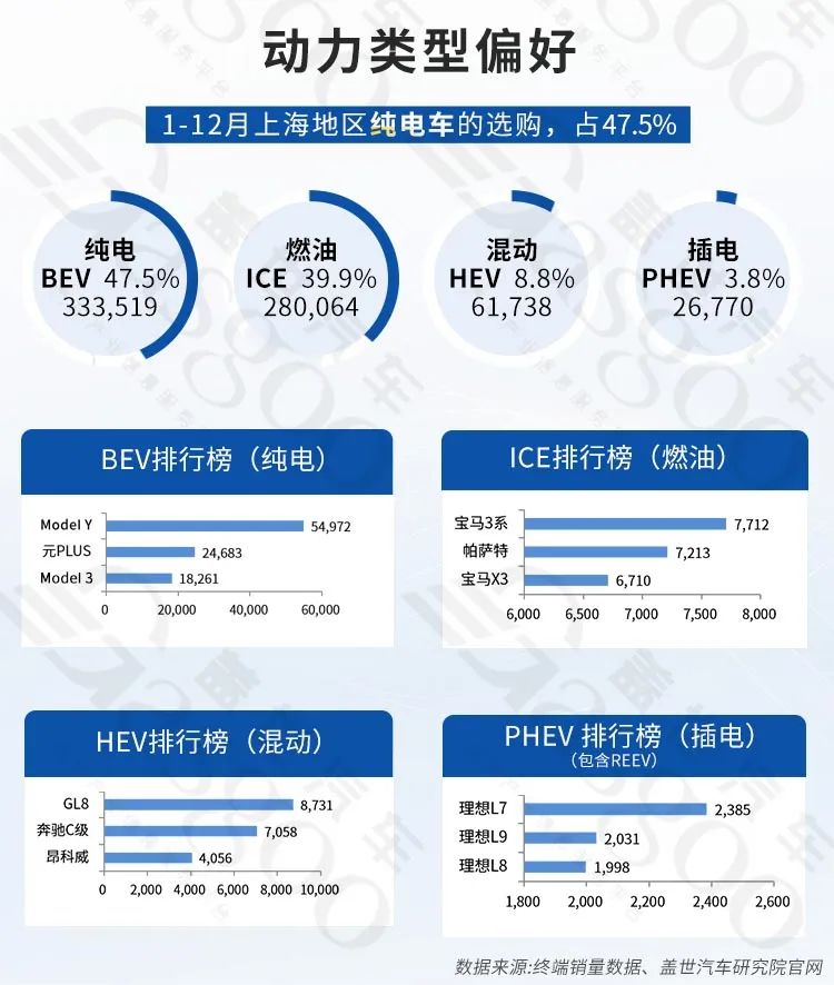在动力类型方面,上海地区1-12月纯电车的选购达到47.5%,燃油车选购比例为39.9%,总销量为280064台,其中宝马3系销量为7712辆,位居燃油车销量榜第一,其次为帕萨特,销量为7213辆,宝马X3排名第三,销量为6710辆。另外,混动车选购比例为8.8%,总销量为61738辆,销量排在前三的车型分别为GL8、奔驰C级和昂科威,插电车型选购比例为3.8%,总销量为26770辆,其中理想L7销量为2385辆,占据销量榜第一,其次为比理想L9和理想L8。