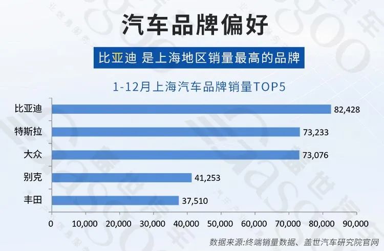 数据显示,比亚迪是上海地区销量最高的品牌,2023年比亚迪在上海共销售汽车82428辆,其次为特斯拉和大众,分别销售汽车73233辆、73076辆。